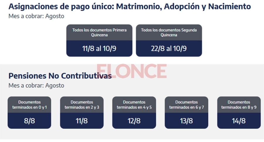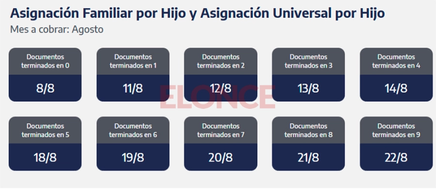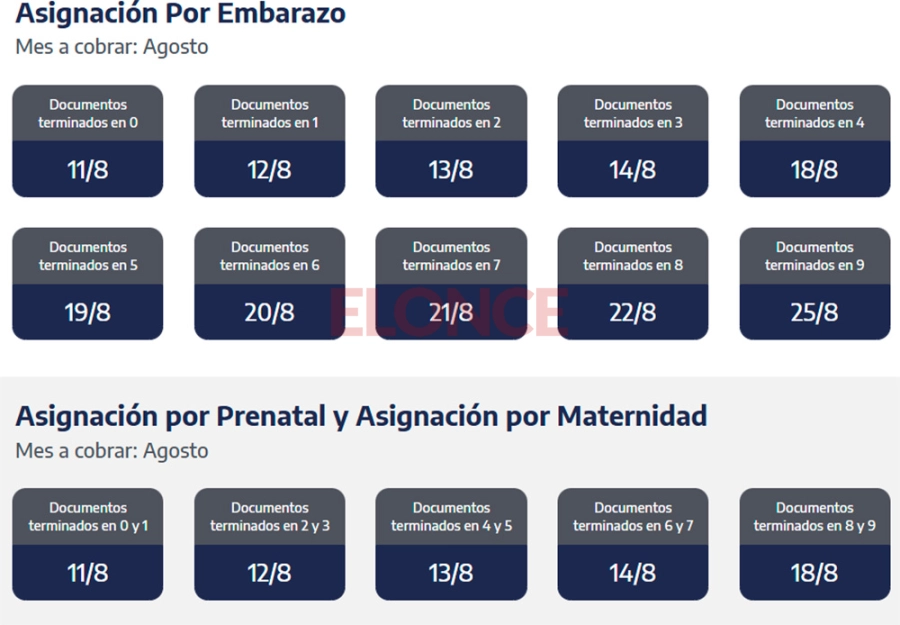 Para las asignaciones por embarazo y las asignaciones por maternidad, los pagos también estarán disponibles a partir del 11 de agosto, comenzando con los documentos terminados en 0. Este es un calendario común para las asignaciones familiares y otros beneficios del sistema de ANSES. El cronograma para estas asignaciones será el siguiente: