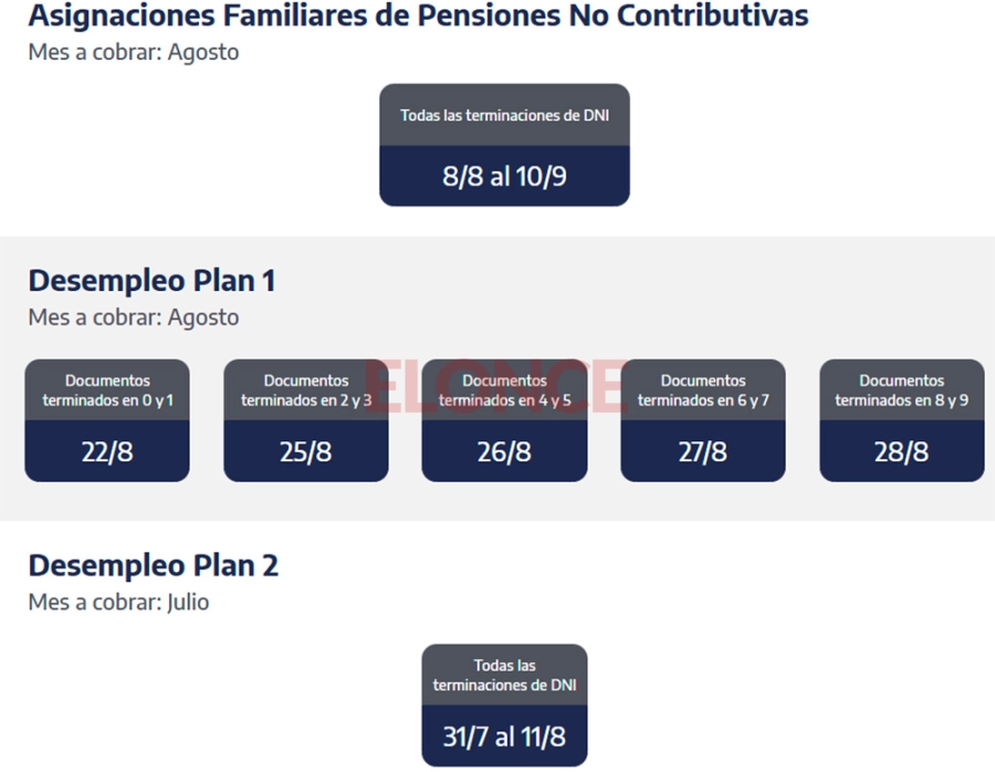 El plan de desempleo 1 también tendrá su cronograma de pagos durante el mes de agosto, de acuerdo con la terminación del DNI de los beneficiarios. Las fechas son las siguientes: