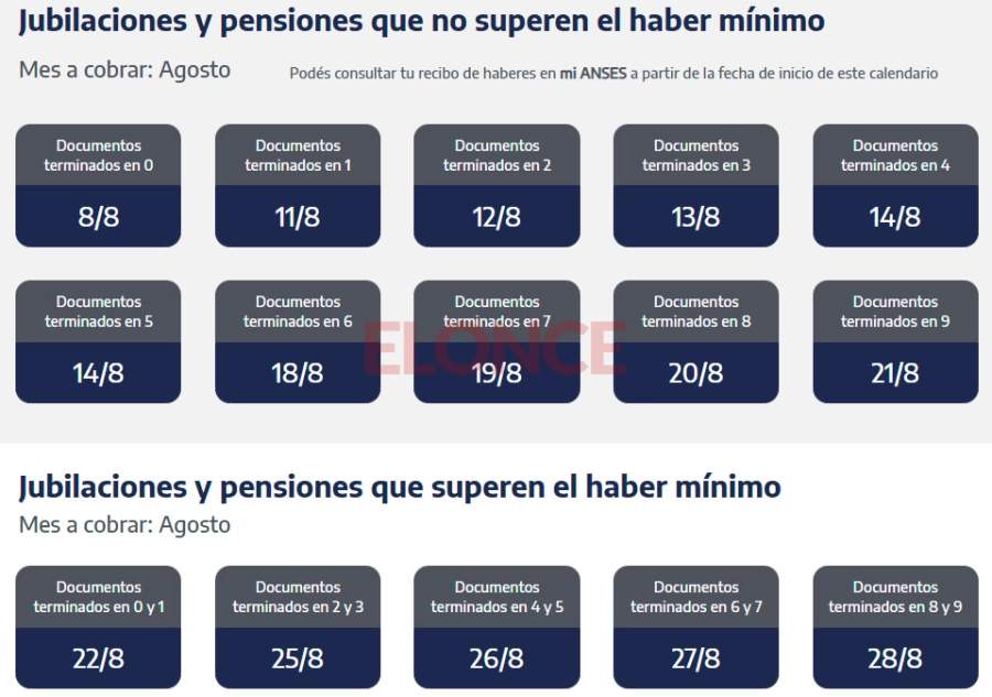 De acuerdo con la información publicada, el pago de las jubilaciones y pensiones comenzará el 8 de agosto para aquellos que no superen el haber mínimo, con los beneficiarios cuyos documentos terminen en 0. Esta es una de las primeras fechas destacadas del calendario, en el que las personas pueden consultar su recibo de haberes a través de mi ANSES a partir de la fecha indicada.