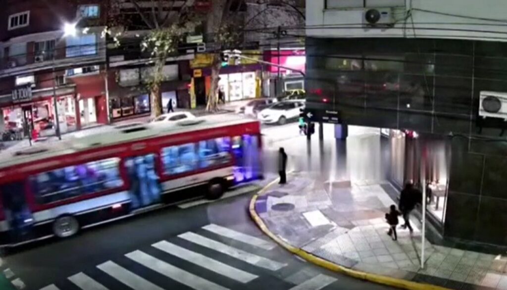 En las imágenes se observa cuando un peatón se encontraba a la espera de cruzar la avenida Santa Fe, en la intersección con la calle Ecuador, cuando fue sorprendido por el colectivo.
