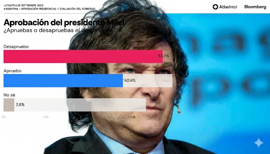 Una nueva y extensa encuesta de la consultora AtlasIntel en conjunto con Bloomberg revela un significativo deterioro en la imagen del presidente Javier Milei y su gobierno, marcando el punto más alto de desaprobación de su gestión. Según el sondeo, la desaprobación de Milei alcanzó el 53,7% en septiembre, mientras que su aprobación cayó al 42,4%.